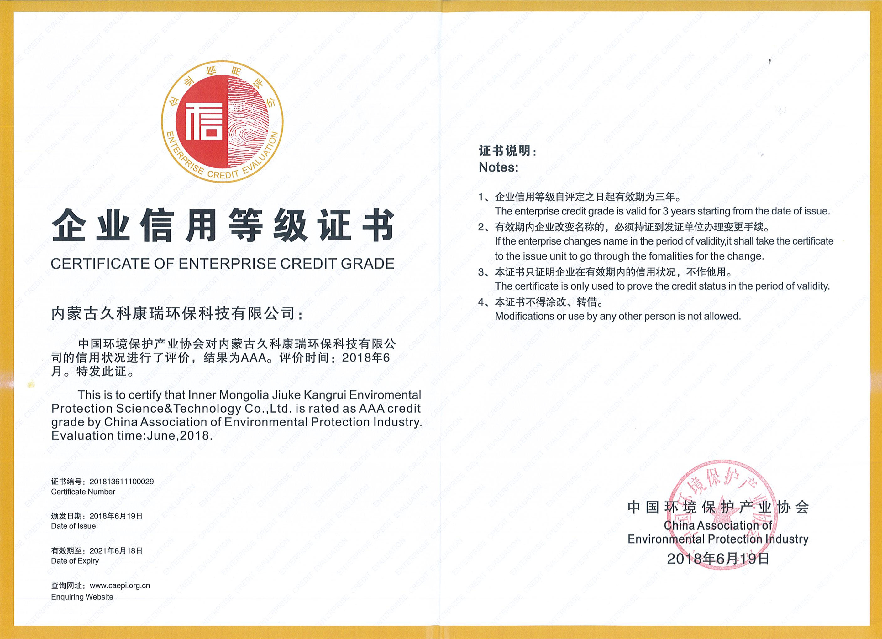 久科環(huán)保經(jīng)過中國環(huán)保產(chǎn)業(yè)協(xié)會信用評價辦公室和信用評價專家委員會的嚴格評價,并通過協(xié)會信用評價工作委員會的實地審核,被評為企業(yè)信用評價等級AAA。