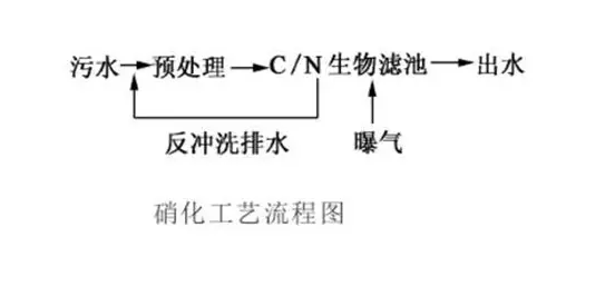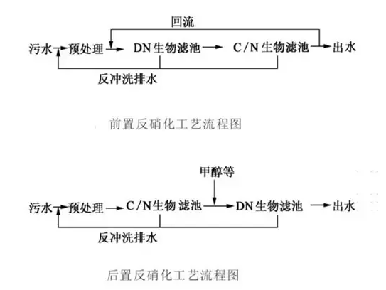 然后經過好氧濾池或濾池的好氧段,好氧池出水回流到反硝化濾池,硝化濾池的出水NO-3-N回流到反硝化濾池,反硝化菌利用進水中的有機物作為電子供體,NO-3-N作為電子受體,進行電子轉移,最終轉化為N2轉移至空氣中,達到廢水脫氮的目的。