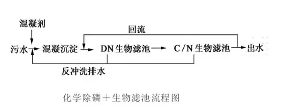該工藝優(yōu)點是工藝流程簡單,控制方便;但藥劑耗量較大,剩余污泥較多,同時由于混凝沉淀去除一部分有機物,有可能引起后續(xù)反硝化碳源不足。另外一種是同步沉淀與絮凝過濾,即在曝氣生物濾池中投加化學藥劑,沉淀物積聚在填料中,通過周期性反沖洗,將磷排出系統(tǒng)外,達到除磷的目的,該工藝藥劑量相對較小,但是污泥被截留在曝氣生物濾池內,會縮短生物濾池的運行周期,增加反沖洗的頻率。